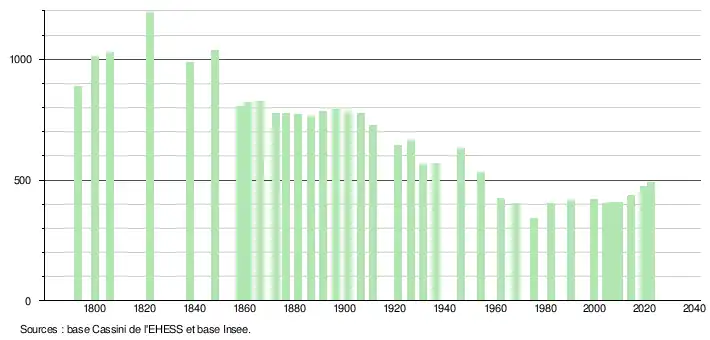 L'évolution du nombre d'habitants est connue à travers les recensements de la population effectués dans la commune depuis 1793. Pour les communes de moins de 10 000 habitants, une enquête de recensement portant sur toute la population est réalisée tous les cinq ans, les populations de référence des années intermédiaires étant quant à elles estimées par interpolation ou extrapolation[12]. Pour la commune, le premier recensement exhaustif entrant dans le cadre du nouveau dispositif a été réalisé en 2004[13].