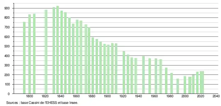 L'évolution du nombre d'habitants est connue à travers les recensements de la population effectués dans la commune depuis 1793. Pour les communes de moins de 10 000 habitants, une enquête de recensement portant sur toute la population est réalisée tous les cinq ans, les populations de référence des années intermédiaires étant quant à elles estimées par interpolation ou extrapolation[24]. Pour la commune, le premier recensement exhaustif entrant dans le cadre du nouveau dispositif a été réalisé en 2005[25].