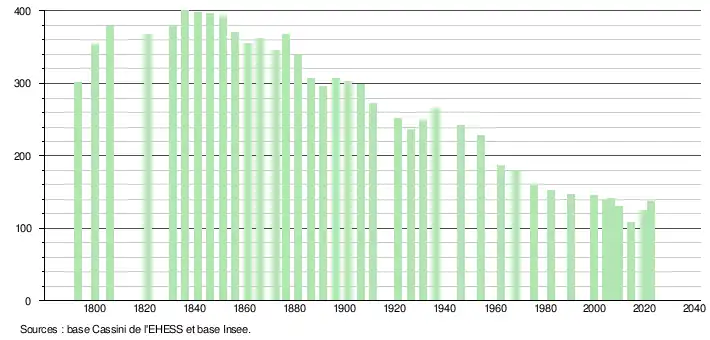 L'évolution du nombre d'habitants est connue à travers les recensements de la population effectués dans la commune depuis 1793. Pour les communes de moins de 10 000 habitants, une enquête de recensement portant sur toute la population est réalisée tous les cinq ans, les populations de référence des années intermédiaires étant quant à elles estimées par interpolation ou extrapolation[17]. Pour la commune, le premier recensement exhaustif entrant dans le cadre du nouveau dispositif a été réalisé en 2004[18].