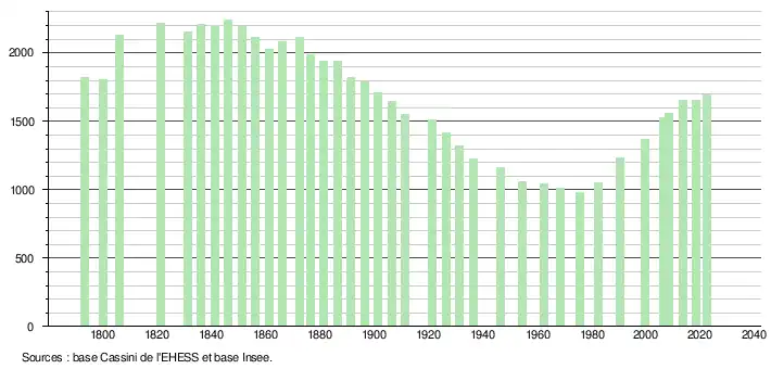 L'évolution du nombre d'habitants est connue à travers les recensements de la population effectués dans la commune depuis 1793. Pour les communes de moins de 10 000 habitants, une enquête de recensement portant sur toute la population est réalisée tous les cinq ans, les populations de référence des années intermédiaires étant quant à elles estimées par interpolation ou extrapolation[29]. Pour la commune, le premier recensement exhaustif entrant dans le cadre du nouveau dispositif a été réalisé en 2008[30].
