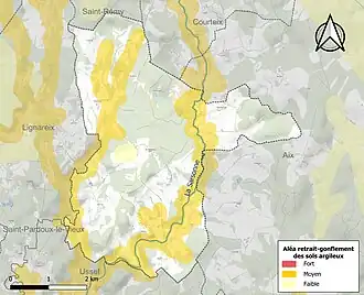Le retrait-gonflement des sols argileux est susceptible d'engendrer des dommages importants aux bâtiments en cas d’alternance de périodes de sécheresse et de pluie. 31,9 % de la superficie communale est en aléa moyen ou fort (26,8 % au niveau départemental et 48,5 % au niveau national). Sur les 57 bâtiments dénombrés sur la commune en 2019, sept sont en aléa moyen ou fort, soit 12 %, à comparer aux 36 % au niveau départemental et 54 % au niveau national. Une cartographie de l'exposition du territoire national au retrait gonflement des sols argileux est disponible sur le site du BRGM[15],[Carte 2].