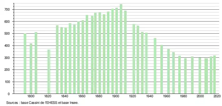 L'évolution du nombre d'habitants est connue à travers les recensements de la population effectués dans la commune depuis 1793. Pour les communes de moins de 10 000 habitants, une enquête de recensement portant sur toute la population est réalisée tous les cinq ans, les populations de référence des années intermédiaires étant quant à elles estimées par interpolation ou extrapolation[3]. Pour la commune, le premier recensement exhaustif entrant dans le cadre du nouveau dispositif a été réalisé en 2007[4].