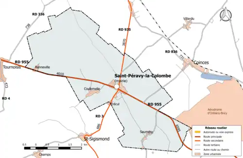 La RD 955 traverse la commune d'est en ouest et relie Ormes à Villamblain. Il s'agit de l'ancienne RN 155 qui, à sa création, en 1824, succède à la Route impériale 175 et relie Orléans à Saint-Malo par Alençon[33]. Elle a été transférée au département du Loiret par arrêté du [34]. En 2014, elle supporte un trafic de 6 595 véhicules/jour à l'est du bourg et de 4 010 à l'ouest[35]. La RD 935 (3 870 véhicules/jour), qui relie Chartres par Patay au bourg de Saint-Péravy-la-Colombe[35]. La RD 3 (886 véhicules/jour) relie Meung-sur-Loire à Rozières-en-Beauce[35].