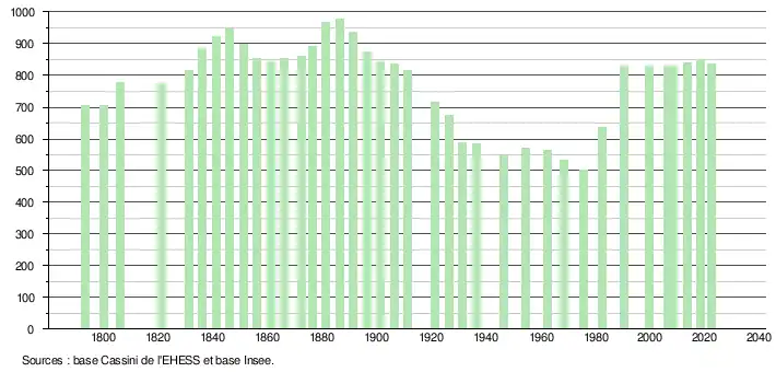 L'évolution du nombre d'habitants est connue à travers les recensements de la population effectués dans la commune depuis 1793. Pour les communes de moins de 10 000 habitants, une enquête de recensement portant sur toute la population est réalisée tous les cinq ans, les populations de référence des années intermédiaires étant quant à elles estimées par interpolation ou extrapolation[13]. Pour la commune, le premier recensement exhaustif entrant dans le cadre du nouveau dispositif a été réalisé en 2008[14].