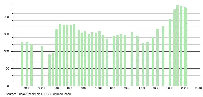 L'évolution du nombre d'habitants est connue à travers les recensements de la population effectués dans la commune depuis 1793. Pour les communes de moins de 10 000 habitants, une enquête de recensement portant sur toute la population est réalisée tous les cinq ans, les populations de référence des années intermédiaires étant quant à elles estimées par interpolation ou extrapolation[57]. Pour la commune, le premier recensement exhaustif entrant dans le cadre du nouveau dispositif a été réalisé en 2005[58].