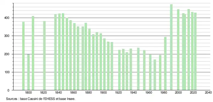 L'évolution du nombre d'habitants est connue à travers les recensements de la population effectués dans la commune depuis 1793. Pour les communes de moins de 10 000 habitants, une enquête de recensement portant sur toute la population est réalisée tous les cinq ans, les populations de référence des années intermédiaires étant quant à elles estimées par interpolation ou extrapolation[17]. Pour la commune, le premier recensement exhaustif entrant dans le cadre du nouveau dispositif a été réalisé en 2008[18].