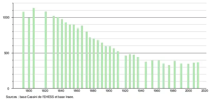 - ↑ Dans le tableau des recensements et le graphique, par convention dans Wikipédia, le principe a été retenu, pour les populations légales postérieures à 1999 de n’afficher dans le tableau des recensements et le graphique que les populations correspondant à l'année 2006, première population légale publiée calculée conformément aux concepts définis dans le décret no 2003-485 du 5 juin 2003, et les années correspondant à une enquête exhaustive de recensement pour les communes de moins de 10 000 habitants, ainsi que la dernière population légale publiée par l’Insee.