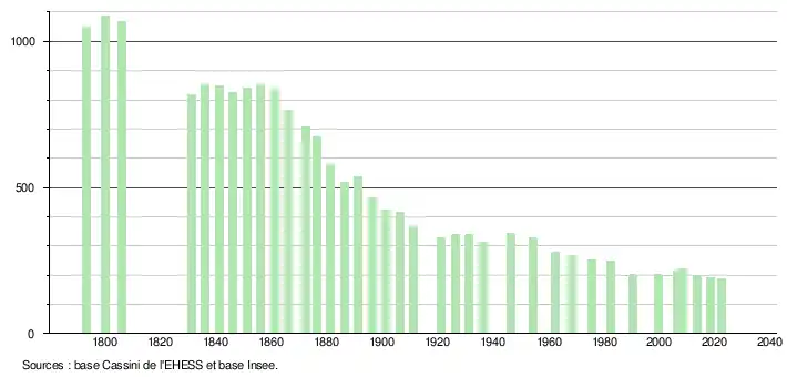 L'évolution du nombre d'habitants est connue à travers les recensements de la population effectués dans la commune depuis 1793. Pour les communes de moins de 10 000 habitants, une enquête de recensement portant sur toute la population est réalisée tous les cinq ans, les populations de référence des années intermédiaires étant quant à elles estimées par interpolation ou extrapolation[26]. Pour la commune, le premier recensement exhaustif entrant dans le cadre du nouveau dispositif a été réalisé en 2008[27].