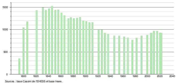 L'évolution du nombre d'habitants est connue à travers les recensements de la population effectués dans la commune depuis 1793. Pour les communes de moins de 10 000 habitants, une enquête de recensement portant sur toute la population est réalisée tous les cinq ans, les populations de référence des années intermédiaires étant quant à elles estimées par interpolation ou extrapolation[29]. Pour la commune, le premier recensement exhaustif entrant dans le cadre du nouveau dispositif a été réalisé en 2005[30].