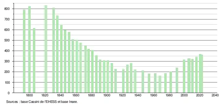 L'évolution du nombre d'habitants est connue à travers les recensements de la population effectués dans la commune depuis 1793. Pour les communes de moins de 10 000 habitants, une enquête de recensement portant sur toute la population est réalisée tous les cinq ans, les populations de référence des années intermédiaires étant quant à elles estimées par interpolation ou extrapolation[14]. Pour la commune, le premier recensement exhaustif entrant dans le cadre du nouveau dispositif a été réalisé en 2005[15].