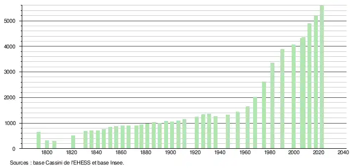 L'évolution du nombre d'habitants est connue à travers les recensements de la population effectués dans la commune depuis 1793. Pour les communes de moins de 10 000 habitants, une enquête de recensement portant sur toute la population est réalisée tous les cinq ans, les populations de référence des années intermédiaires étant quant à elles estimées par interpolation ou extrapolation[27]. Pour la commune, le premier recensement exhaustif entrant dans le cadre du nouveau dispositif a été réalisé en 2007[28].