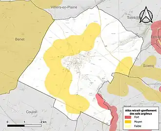 Les mouvements de terrains susceptibles de se produire sur la commune sont des tassements différentiels[15]. Le retrait-gonflement des sols argileux est susceptible d'engendrer des dommages importants aux bâtiments en cas d’alternance de périodes de sécheresse et de pluie[16]. 31 % de la superficie communale est en aléa moyen ou fort (54,9 % au niveau départemental et 48,5 % au niveau national)[Carte 2]. Depuis le , en application de la loi ELAN, différentes contraintes s'imposent aux vendeurs, maîtres d'ouvrages ou constructeurs de biens situés dans une zone classée en aléa moyen ou fort[Note 2],[17].