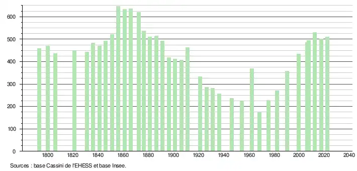 L'évolution du nombre d'habitants est connue à travers les recensements de la population effectués dans la commune depuis 1793. Pour les communes de moins de 10 000 habitants, une enquête de recensement portant sur toute la population est réalisée tous les cinq ans, les populations de référence des années intermédiaires étant quant à elles estimées par interpolation ou extrapolation[24]. Pour la commune, le premier recensement exhaustif entrant dans le cadre du nouveau dispositif a été réalisé en 2007[25].