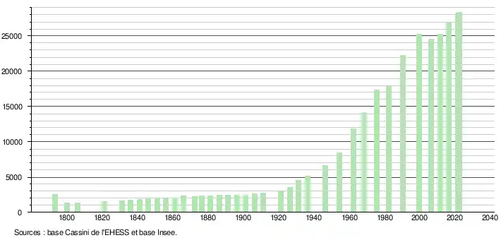 ↑ Par convention dans Wikipédia, le principe a été retenu de n’afficher dans le tableau des recensements et le graphique, pour les populations de référence postérieures à 1999, que les populations correspondant à une enquête exhaustive de recensement pour les communes de moins de 10000habitants, et que les populations des années 2006, 2011, 2016, etc. pour les communes de plus de 10000habitants, ainsi que la dernière population de référence publiée par l’Insee pour l'ensemble des communes.