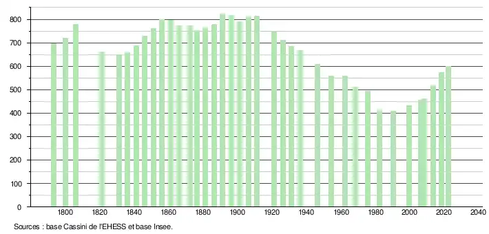L'évolution du nombre d'habitants est connue à travers les recensements de la population effectués dans la commune depuis 1793. Pour les communes de moins de 10 000 habitants, une enquête de recensement portant sur toute la population est réalisée tous les cinq ans, les populations de référence des années intermédiaires étant quant à elles estimées par interpolation ou extrapolation[39]. Pour la commune, le premier recensement exhaustif entrant dans le cadre du nouveau dispositif a été réalisé en 2008[40].
