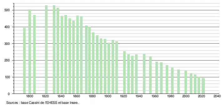 L'évolution du nombre d'habitants est connue à travers les recensements de la population effectués dans la commune depuis 1793. Pour les communes de moins de 10 000 habitants, une enquête de recensement portant sur toute la population est réalisée tous les cinq ans, les populations de référence des années intermédiaires étant quant à elles estimées par interpolation ou extrapolation[16]. Pour la commune, le premier recensement exhaustif entrant dans le cadre du nouveau dispositif a été réalisé en 2006[17].