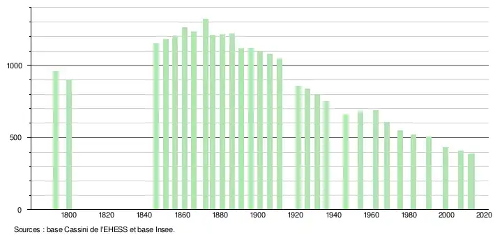 L'évolution du nombre d'habitants est connue à travers les recensements de la population effectués dans la commune depuis 1793. À partir du , les populations légales des communes sont publiées annuellement dans le cadre d'un recensement qui repose désormais sur une collecte d'information annuelle, concernant successivement tous les territoires communaux au cours d'une période de cinq ans. Pour les communes de moins de 10 000 habitants, une enquête de recensement portant sur toute la population est réalisée tous les cinq ans, les populations légales des années intermédiaires étant quant à elles estimées par interpolation ou extrapolation[2]. Pour la commune, le premier recensement exhaustif entrant dans le cadre du nouveau dispositif a été réalisé en 2007[3],[Note 1].