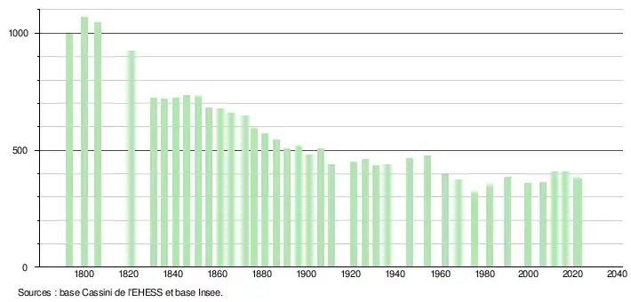 L'évolution du nombre d'habitants est connue à travers les recensements de la population effectués dans la commune depuis 1793. Pour les communes de moins de 10 000 habitants, une enquête de recensement portant sur toute la population est réalisée tous les cinq ans, les populations de référence des années intermédiaires étant quant à elles estimées par interpolation ou extrapolation[40]. Pour la commune, le premier recensement exhaustif entrant dans le cadre du nouveau dispositif a été réalisé en 2006[41].