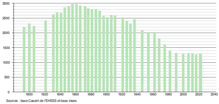 L'évolution du nombre d'habitants est connue à travers les recensements de la population effectués dans la commune depuis 1793. Pour les communes de moins de 10 000 habitants, une enquête de recensement portant sur toute la population est réalisée tous les cinq ans, les populations de référence des années intermédiaires étant quant à elles estimées par interpolation ou extrapolation[23]. Pour la commune, le premier recensement exhaustif entrant dans le cadre du nouveau dispositif a été réalisé en 2006[24].
