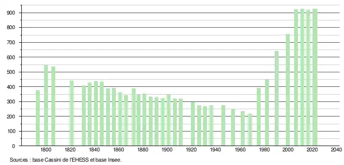 L'évolution du nombre d'habitants est connue à travers les recensements de la population effectués dans la commune depuis 1793. Pour les communes de moins de 10 000 habitants, une enquête de recensement portant sur toute la population est réalisée tous les cinq ans, les populations de référence des années intermédiaires étant quant à elles estimées par interpolation ou extrapolation[22]. Pour la commune, le premier recensement exhaustif entrant dans le cadre du nouveau dispositif a été réalisé en 2006[23].