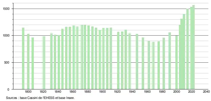 L'évolution du nombre d'habitants est connue à travers les recensements de la population effectués dans la commune depuis 1793. Pour les communes de moins de 10 000 habitants, une enquête de recensement portant sur toute la population est réalisée tous les cinq ans, les populations de référence des années intermédiaires étant quant à elles estimées par interpolation ou extrapolation[29]. Pour la commune, le premier recensement exhaustif entrant dans le cadre du nouveau dispositif a été réalisé en 2004[30].