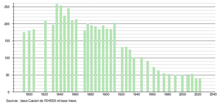 L'évolution du nombre d'habitants est connue à travers les recensements de la population effectués dans la commune depuis 1793. Pour les communes de moins de 10 000 habitants, une enquête de recensement portant sur toute la population est réalisée tous les cinq ans, les populations de référence des années intermédiaires étant quant à elles estimées par interpolation ou extrapolation[20]. Pour la commune, le premier recensement exhaustif entrant dans le cadre du nouveau dispositif a été réalisé en 2007[21].
