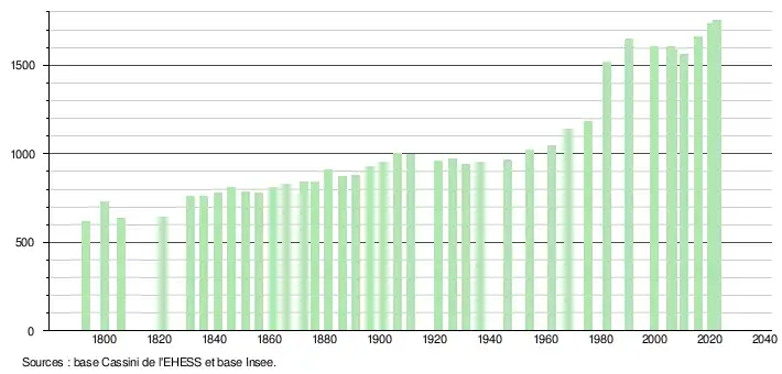 L'évolution du nombre d'habitants est connue à travers les recensements de la population effectués dans la commune depuis 1793. Pour les communes de moins de 10 000 habitants, une enquête de recensement portant sur toute la population est réalisée tous les cinq ans, les populations de référence des années intermédiaires étant quant à elles estimées par interpolation ou extrapolation[35]. Pour la commune, le premier recensement exhaustif entrant dans le cadre du nouveau dispositif a été réalisé en 2005[36].