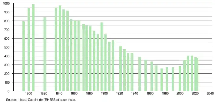 L'évolution du nombre d'habitants est connue à travers les recensements de la population effectués dans la commune depuis 1793. Pour les communes de moins de 10 000 habitants, une enquête de recensement portant sur toute la population est réalisée tous les cinq ans, les populations de référence des années intermédiaires étant quant à elles estimées par interpolation ou extrapolation[29]. Pour la commune, le premier recensement exhaustif entrant dans le cadre du nouveau dispositif a été réalisé en 2005[30].