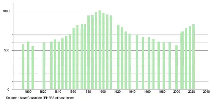 L'évolution du nombre d'habitants est connue à travers les recensements de la population effectués dans la commune depuis 1793. Pour les communes de moins de 10 000 habitants, une enquête de recensement portant sur toute la population est réalisée tous les cinq ans, les populations de référence des années intermédiaires étant quant à elles estimées par interpolation ou extrapolation[24]. Pour la commune, le premier recensement exhaustif entrant dans le cadre du nouveau dispositif a été réalisé en 2007[25].