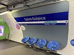 Saint-Sulpice est une station de configuration standard : elle possède deux quais séparés par les voies du métro et la voûte est elliptique. Les sièges sont de type Akiko de couleur bleue.