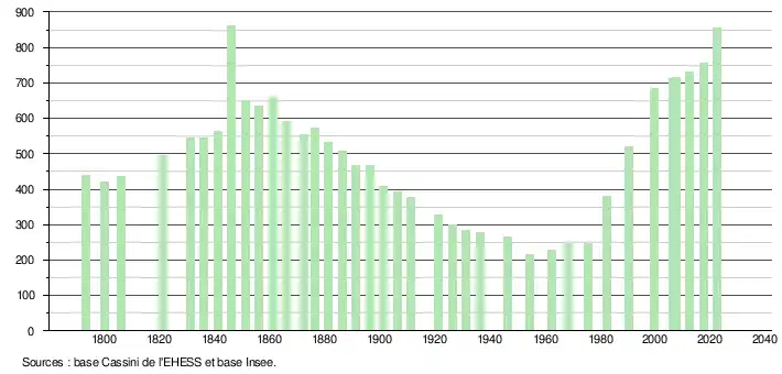 L'évolution du nombre d'habitants est connue à travers les recensements de la population effectués dans la commune depuis 1793. Pour les communes de moins de 10 000 habitants, une enquête de recensement portant sur toute la population est réalisée tous les cinq ans, les populations de référence des années intermédiaires étant quant à elles estimées par interpolation ou extrapolation[17]. Pour la commune, le premier recensement exhaustif entrant dans le cadre du nouveau dispositif a été réalisé en 2007[18].