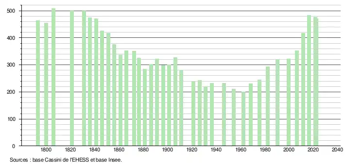 L'évolution du nombre d'habitants est connue à travers les recensements de la population effectués dans la commune depuis 1793. Pour les communes de moins de 10 000 habitants, une enquête de recensement portant sur toute la population est réalisée tous les cinq ans, les populations de référence des années intermédiaires étant quant à elles estimées par interpolation ou extrapolation[29]. Pour la commune, le premier recensement exhaustif entrant dans le cadre du nouveau dispositif a été réalisé en 2006[30].