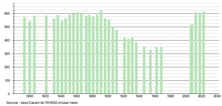 L'évolution du nombre d'habitants est connue à travers les recensements de la population effectués dans la commune depuis 1793. Pour les communes de moins de 10 000 habitants, une enquête de recensement portant sur toute la population est réalisée tous les cinq ans, les populations de référence des années intermédiaires étant quant à elles estimées par interpolation ou extrapolation[13]. Pour la commune, le premier recensement exhaustif entrant dans le cadre du nouveau dispositif a été réalisé en 2007[14].