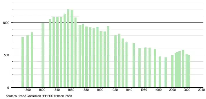 L'évolution du nombre d'habitants est connue à travers les recensements de la population effectués dans la commune depuis 1793. Pour les communes de moins de 10 000 habitants, une enquête de recensement portant sur toute la population est réalisée tous les cinq ans, les populations de référence des années intermédiaires étant quant à elles estimées par interpolation ou extrapolation[18]. Pour la commune, le premier recensement exhaustif entrant dans le cadre du nouveau dispositif a été réalisé en 2004[19].