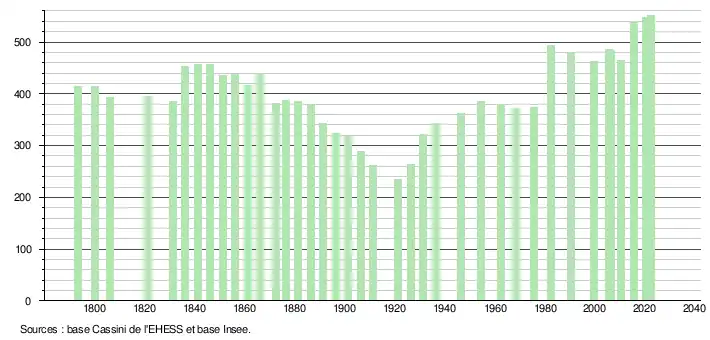 L'évolution du nombre d'habitants est connue à travers les recensements de la population effectués dans la commune depuis 1793. Pour les communes de moins de 10 000 habitants, une enquête de recensement portant sur toute la population est réalisée tous les cinq ans, les populations de référence des années intermédiaires étant quant à elles estimées par interpolation ou extrapolation[20]. Pour la commune, le premier recensement exhaustif entrant dans le cadre du nouveau dispositif a été réalisé en 2005[21].