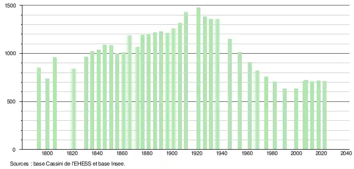 L'évolution du nombre d'habitants est connue à travers les recensements de la population effectués dans la commune depuis 1793. Pour les communes de moins de 10 000 habitants, une enquête de recensement portant sur toute la population est réalisée tous les cinq ans, les populations de référence des années intermédiaires étant quant à elles estimées par interpolation ou extrapolation[49]. Pour la commune, le premier recensement exhaustif entrant dans le cadre du nouveau dispositif a été réalisé en 2007[50].