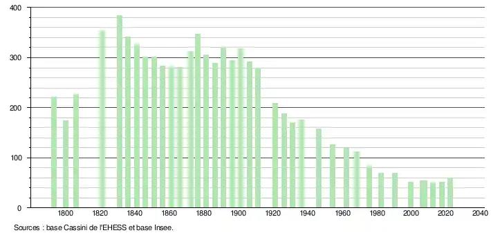 L'évolution du nombre d'habitants est connue à travers les recensements de la population effectués dans la commune depuis 1793. Pour les communes de moins de 10 000 habitants, une enquête de recensement portant sur toute la population est réalisée tous les cinq ans, les populations de référence des années intermédiaires étant quant à elles estimées par interpolation ou extrapolation[22]. Pour la commune, le premier recensement exhaustif entrant dans le cadre du nouveau dispositif a été réalisé en 2007[23].