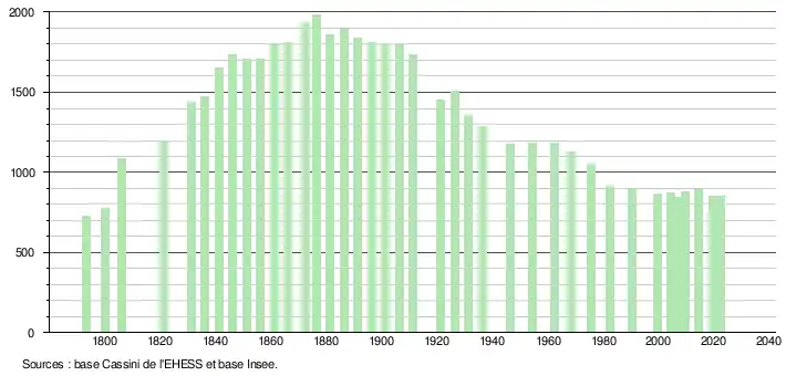 L'évolution du nombre d'habitants est connue à travers les recensements de la population effectués dans la commune depuis 1793. Pour les communes de moins de 10 000 habitants, une enquête de recensement portant sur toute la population est réalisée tous les cinq ans, les populations de référence des années intermédiaires étant quant à elles estimées par interpolation ou extrapolation[27]. Pour la commune, le premier recensement exhaustif entrant dans le cadre du nouveau dispositif a été réalisé en 2004[28].
