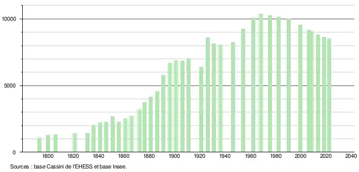 - ↑ Population municipale de référence en vigueur au 1er janvier 2025, millésimée 2022, définie dans les limites territoriales en vigueur au 1er janvier 2024, date de référence statistique : 1er janvier 2022.