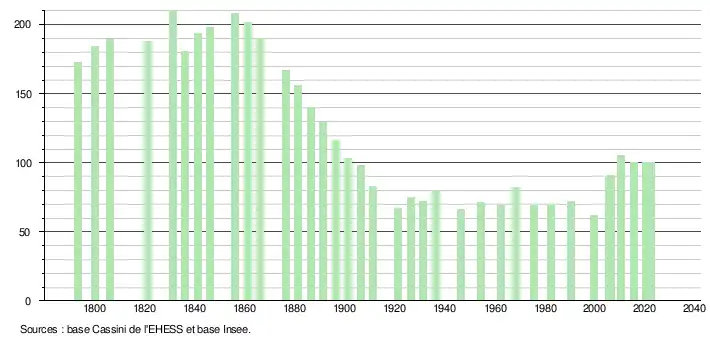 L'évolution du nombre d'habitants est connue à travers les recensements de la population effectués dans la commune depuis 1793. Pour les communes de moins de 10 000 habitants, une enquête de recensement portant sur toute la population est réalisée tous les cinq ans, les populations de référence des années intermédiaires étant quant à elles estimées par interpolation ou extrapolation[34]. Pour la commune, le premier recensement exhaustif entrant dans le cadre du nouveau dispositif a été réalisé en 2005[35].