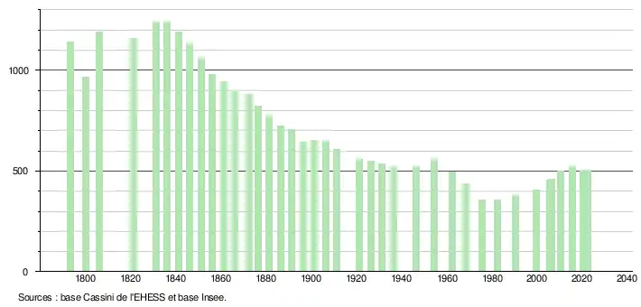 L'évolution du nombre d'habitants est connue à travers les recensements de la population effectués dans la commune depuis 1793. Pour les communes de moins de 10 000 habitants, une enquête de recensement portant sur toute la population est réalisée tous les cinq ans, les populations de référence des années intermédiaires étant quant à elles estimées par interpolation ou extrapolation[18]. Pour la commune, le premier recensement exhaustif entrant dans le cadre du nouveau dispositif a été réalisé en 2005[19].