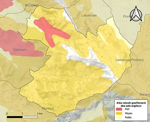 Le retrait-gonflement des sols argileux est susceptible d'engendrer des dommages importants aux bâtiments en cas d’alternance de périodes de sécheresse et de pluie[29]. 87,4 % de la superficie communale est en aléa moyen ou fort (59 % au niveau départemental et 48,5 % au niveau national)[Carte 5]. Depuis le , en application de la loi ELAN, différentes contraintes s'imposent aux vendeurs, maîtres d'ouvrages ou constructeurs de biens situés dans une zone classée en aléa moyen ou fort[Note 6],[30].