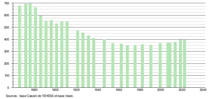 L'évolution du nombre d'habitants est connue à travers les recensements de la population effectués dans la commune depuis 1866. Pour les communes de moins de 10 000 habitants, une enquête de recensement portant sur toute la population est réalisée tous les cinq ans, les populations de référence des années intermédiaires étant quant à elles estimées par interpolation ou extrapolation[35]. Pour la commune, le premier recensement exhaustif entrant dans le cadre du nouveau dispositif a été réalisé en 2008[36].