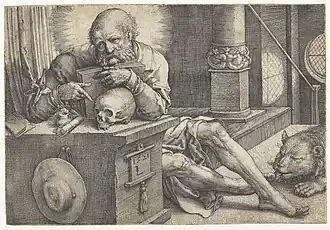 Saint Jérôme dans son étude est à rapprocher du tableau de Saint Jérôme qu'Albrecht Dürer peint en 1521 à Anvers et offert à Rodrigo Fernandez d'Almada, le délégué commercial portugais aux Pays-Bas. Lucas van Leyden reprend principalement à Dürer le type d'un saint Jérôme âgé, absorbé par ses pensées consacrées à la contingence de la condition humaine, comme l'indique son index dirigé vers un Crâne humain[1].