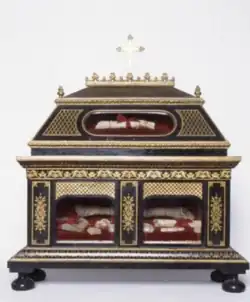 | Description matérielle | Châsse à couvercle, en chêne peint en noir et or. Elle est en forme de toit brisé à croupes. Corps des reliquaires à décor peint en doré et corniche rapportée en métal. Couvercle emboîté maintenu par 2 tenons rectangulaires à l'avant et 2 pattes métalliques à l'arrière, assemblage à queues d'aronde aux angles ; moulures, crête et croix en métal clouées ou vissées. |