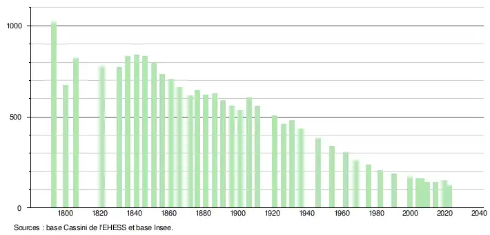 L'évolution du nombre d'habitants est connue à travers les recensements de la population effectués dans la commune depuis 1793. Pour les communes de moins de 10 000 habitants, une enquête de recensement portant sur toute la population est réalisée tous les cinq ans, les populations de référence des années intermédiaires étant quant à elles estimées par interpolation ou extrapolation[8]. Pour la commune, le premier recensement exhaustif entrant dans le cadre du nouveau dispositif a été réalisé en 2004[9].