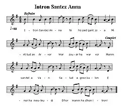 O Mamm Santez Anna Dindan ho tivaskell[30] Pegen kaer eo bevañ[31], Pegen dous eo mervel ! |