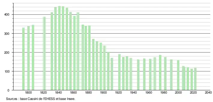 | L'évolution du nombre d'habitants est connue à travers les recensements de la population effectués dans la commune depuis 1793. Pour les communes de moins de 10 000 habitants, une enquête de recensement portant sur toute la population est réalisée tous les cinq ans, les populations de référence des années intermédiaires étant quant à elles estimées par interpolation ou extrapolation[31]. Pour la commune, le premier recensement exhaustif entrant dans le cadre du nouveau dispositif a été réalisé en 2007[32]. En 2022, la commune comptait 120 habitants[Note 7], en évolution de +3,45 % par rapport à 2016 (Tarn : +2,52 %, France hors Mayotte : +2,11 %). |