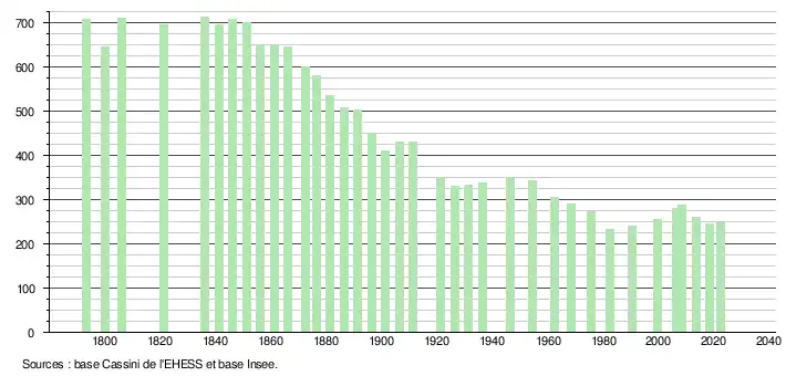 - ↑ Population municipale de référence en vigueur au 1er janvier 2025, millésimée 2022, définie dans les limites territoriales en vigueur au 1er janvier 2024, date de référence statistique : 1er janvier 2022.