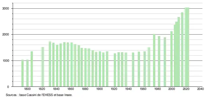 L'évolution du nombre d'habitants est connue à travers les recensements de la population effectués dans la commune depuis 1793. Pour les communes de moins de 10 000 habitants, une enquête de recensement portant sur toute la population est réalisée tous les cinq ans, les populations de référence des années intermédiaires étant quant à elles estimées par interpolation ou extrapolation[25]. Pour la commune, le premier recensement exhaustif entrant dans le cadre du nouveau dispositif a été réalisé en 2004[26].